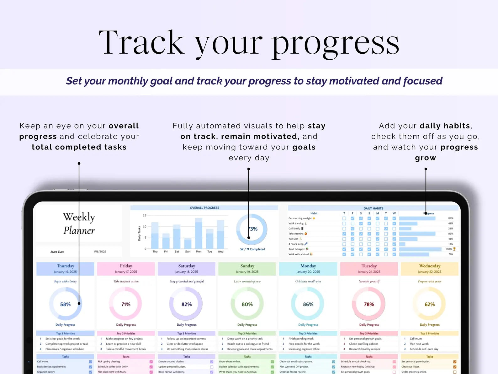 Stay organized and boost your productivity with this comprehensive digital planner. Track daily tasks, manage your weekly schedule, and monitor habits all in one place. This Google Sheets template combines a task checklist, routine tracker, and goal planner to help you build better habits and achieve your objectives. Perfect for anyone looking to streamline their workflow and maintain consistent progress toward their goals. Fully customizable and easy to use.